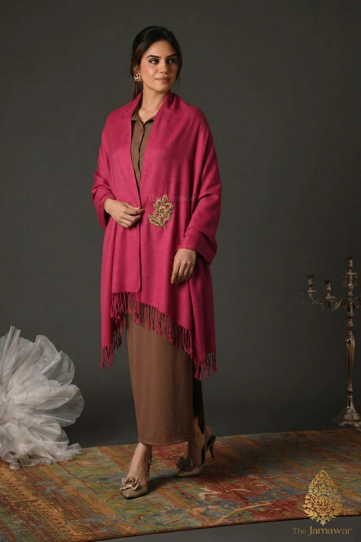 Designed in a pink hue, this wrap is enhanced with an antique gold brooch, adding a touch of elegance to your winter wardrobe. Perfect for winter occasions, it’s a unique alternative to plain stoles, helping you make a bold statement this season.