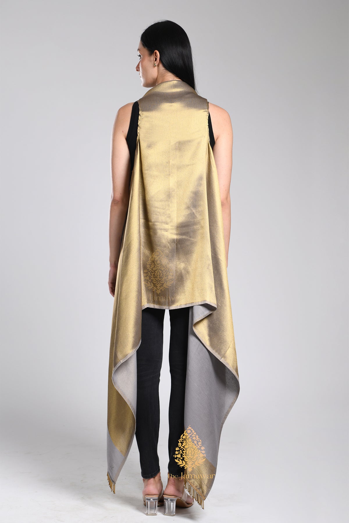 A statement in fluid elegance — this reversible metallic drape stole blends molten gold with serene grey, creating a silhouette that moves with effortless grace. Designed for the woman who loves versatility, it transforms from day to evening with a simple flip, offering two timeless looks in one.