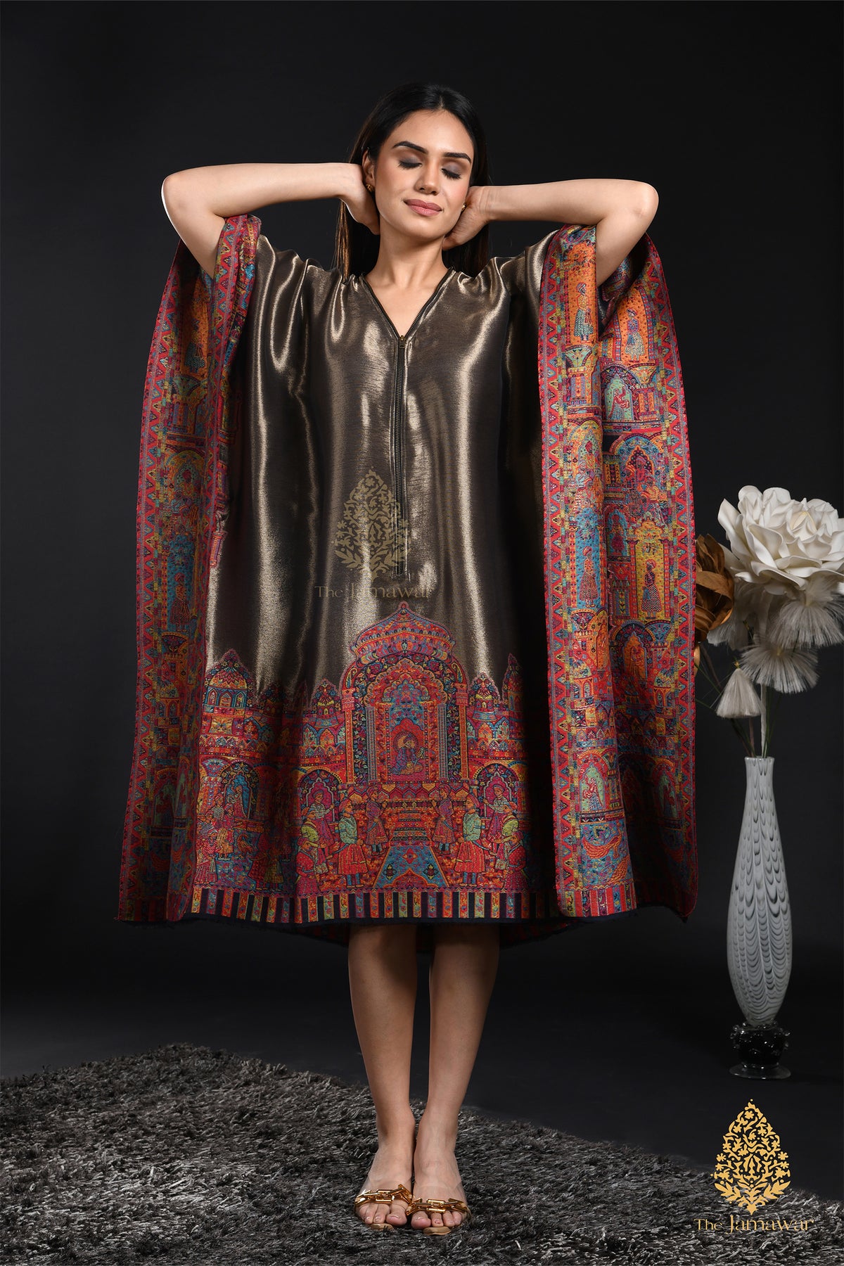Embrace quiet luxury with the Metallic Bronze Jamawar Kaftan, where shimmering fabric flows like liquid gold. Detailed with intricate Jamawar borders, it showcases expert craftsmanship that honors rich heritage. This kaftan blends tradition with elegance, perfect for those who appreciate refined style and timeless artistry. Elevate your ensemble with a piece that radiates regal charm and celebration of Indian craftsmanship.