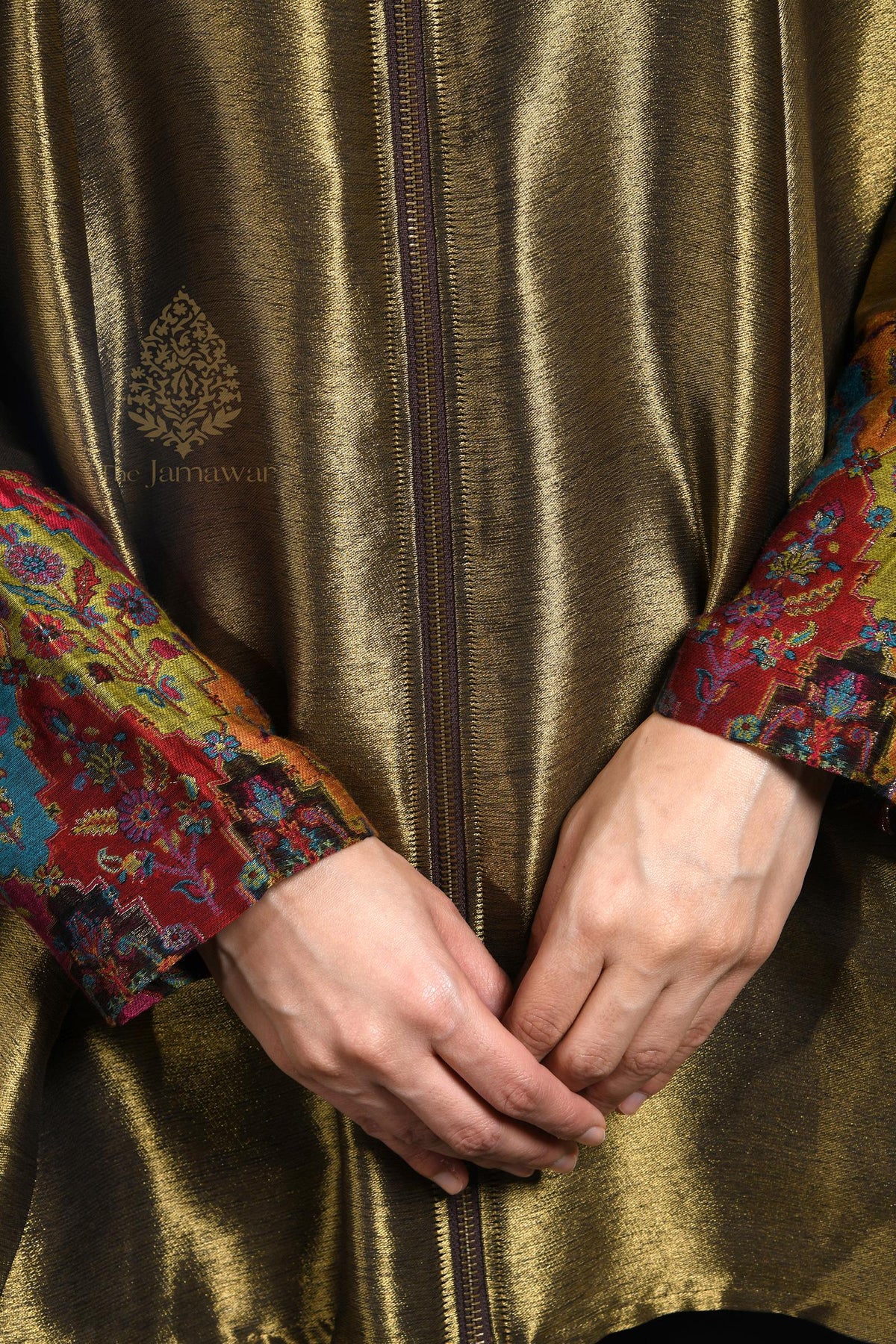 Elevate your evening wear with the Timeless Gold Jamawar Jacket from The Jamawar. Crafted from a lustrous fabric that gracefully drapes, this jacket features vibrant, intricately detailed cuffs and collar that add a regal touch. Perfect for festive gatherings and elegant soirées, it promises to make you stand out with effortless sophistication and charm.